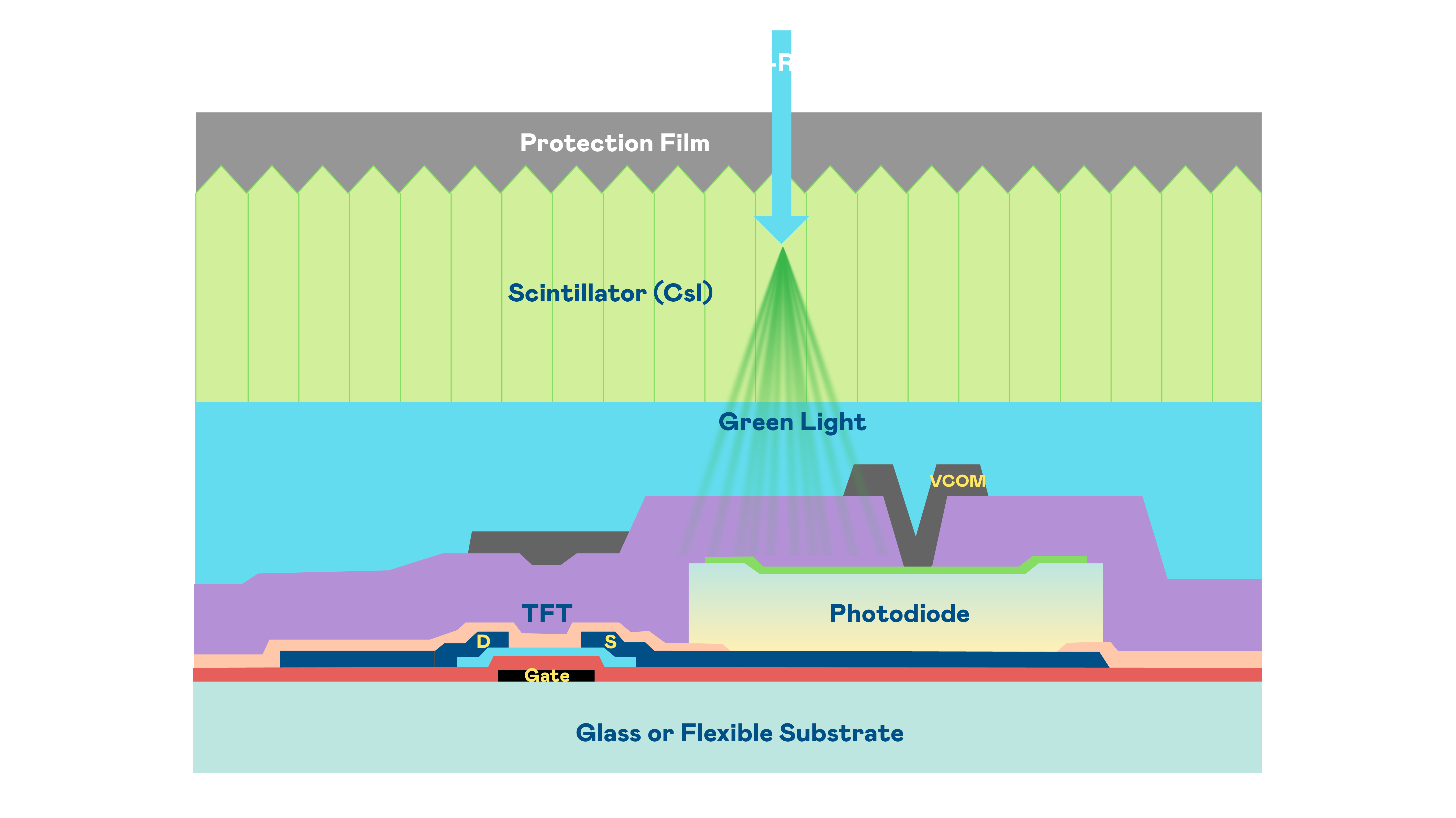 鉴黄师在线观看免费版的X光影像感测阵列使用薄膜电晶体 (TFT) 作为每个像素的读取开关,搭配光电二极体(Photodiode)的光电转换元件,用以感测X光影像讯号。